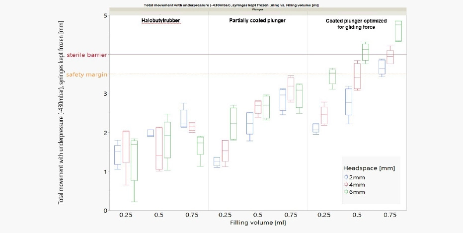 The first question addressed is the effects on the sterile barrier, which can be breached by excessive plunger movement. Three factors have an influence on plunger movement: the amount of headspace, filling volume, and type of plunger. Different freezing temperatures and filling mediums were tested, but no difference was observed.